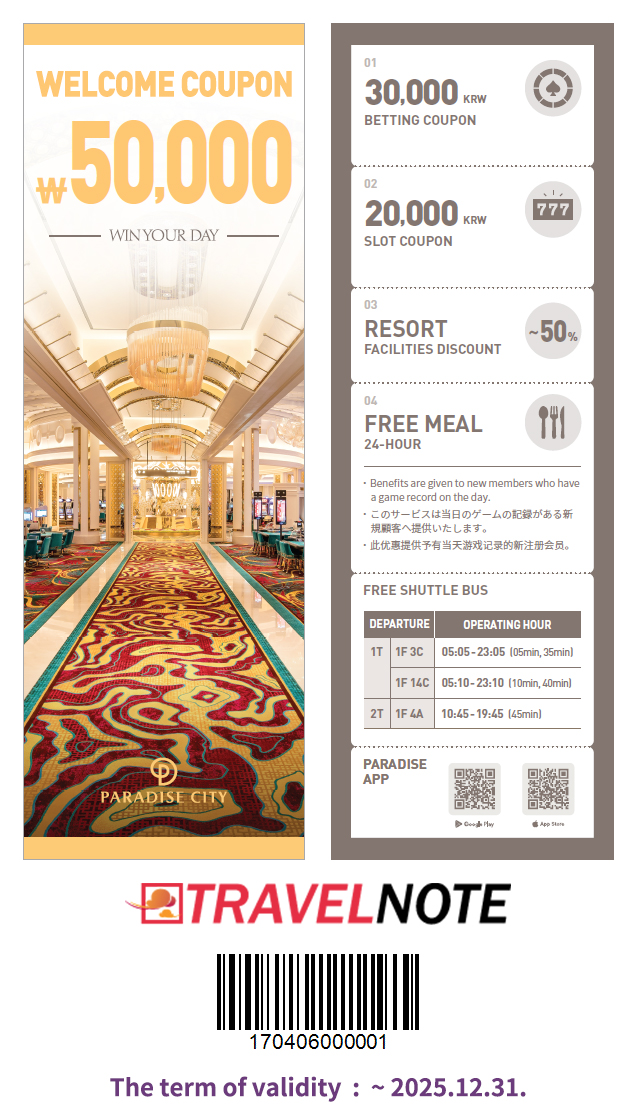* 본 쿠폰은 파라다이스 카지노 그룹(서울·인천·부산·제주) 4개 지점 공통 쿠폰이며, 4개 지점 모두 방문 이력이 없는 신규 고객만 대상입니다.